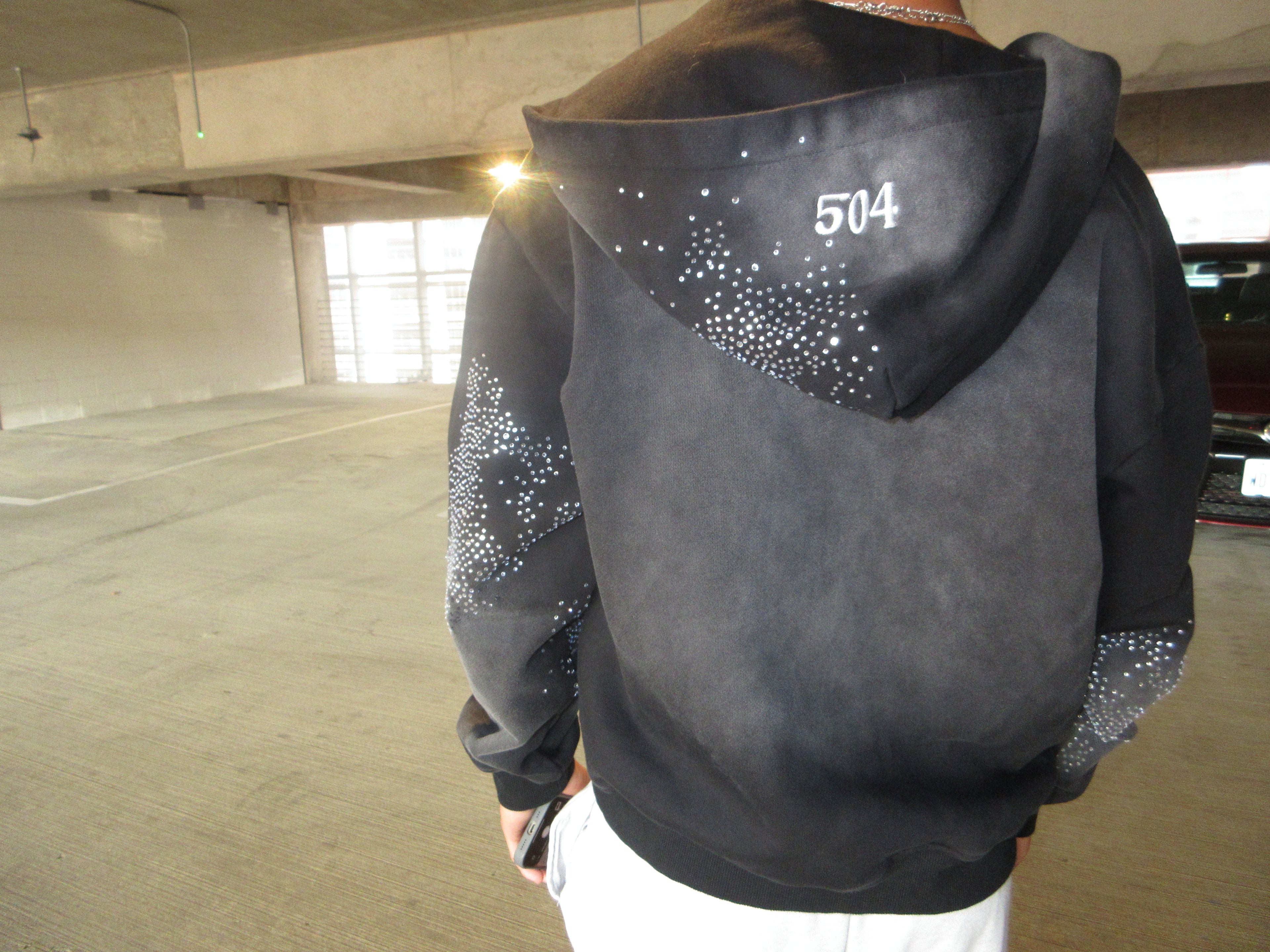 This heavyweight black zip-up features a bold gradient of hand-set rhinestones that shimmer under any light, giving it a starry-night effect. With a relaxed fit, front pockets, and soft fleece lining, it's perfect for standing out while staying comfortable. Finished with a sturdy zipper and subtle fade on the sleeves and body.